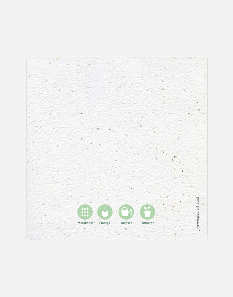 Cette carte est imprimée sur du papier ensemencé. Ce papier, biodégradable et compostable, est fabriqué à partir de fibres recyclées. Il est serti de graines et peut être planté. À toutes les étapes de la fabrication et de l’impression, nous faisons en sorte que soient préservés les qualités germinatoires et le caractère éco-responsable de nos produits.