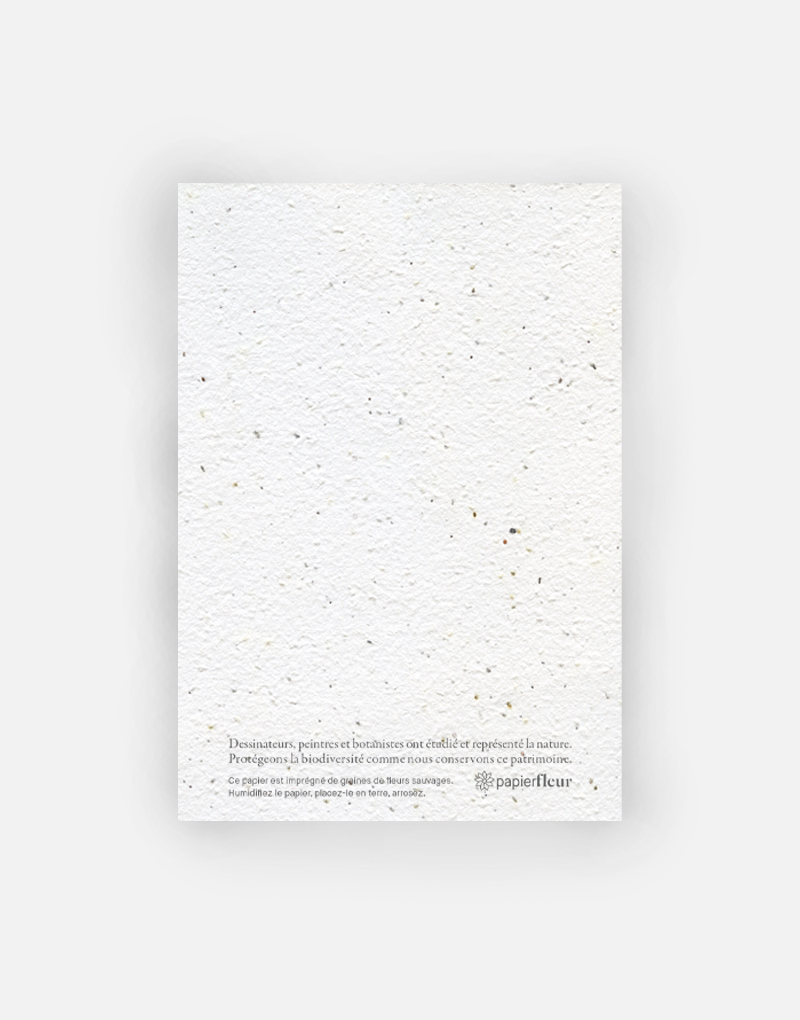 Cette carte est imprimée sur du papier ensemencé. Ce papier, biodégradable et compostable, est fabriqué à partir de fibres recyclées. Il est serti de graines et peut être planté. À toutes les étapes de la fabrication et de l’impression, nous faisons en sorte que soient préservés les qualités germinatoires et le caractère éco-responsable de nos produits.