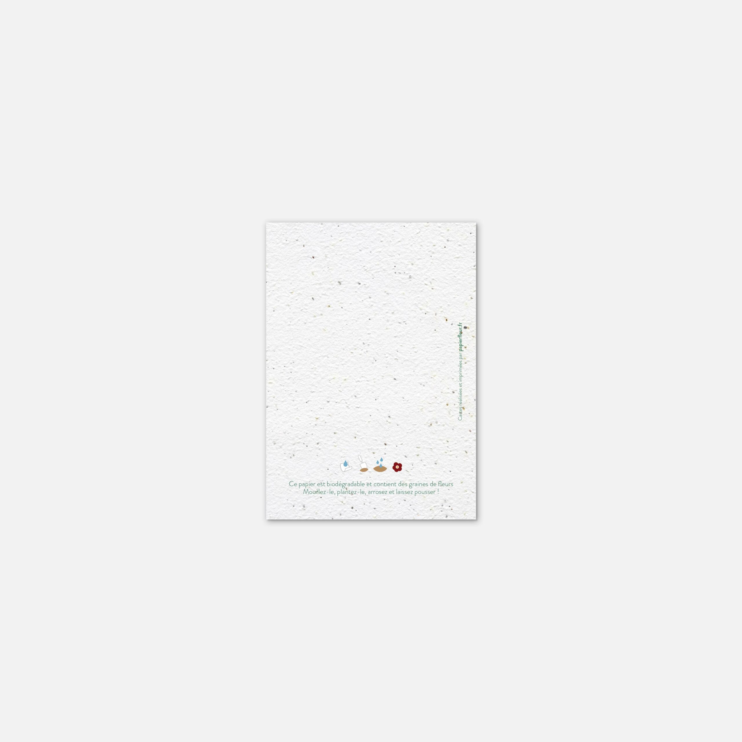 Cette carte est imprimée sur du papier ensemencé. Ce papier, biodégradable et compostable, est fabriqué à partir de fibres recyclées. Il est serti de graines et peut être planté. À toutes les étapes de la fabrication et de l’impression, nous faisons en sorte que soient préservés les qualités germinatoires et le caractère éco-responsable de nos produits.