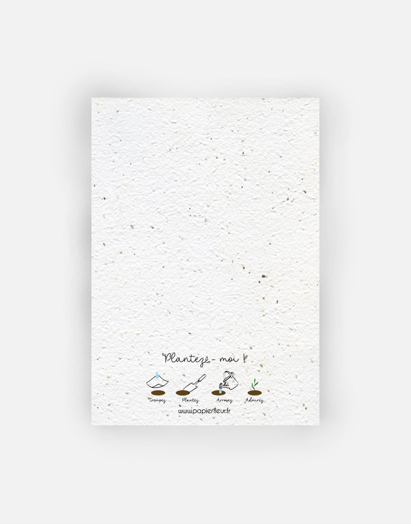 Cette carte est imprimée sur du papier ensemencé. Ce papier, biodégradable et compostable, est fabriqué à partir de fibres recyclées. Il est serti de graines et peut être planté. À toutes les étapes de la fabrication et de l’impression, nous faisons en sorte que soient préservés les qualités germinatoires et le caractère éco-responsable de nos produits.