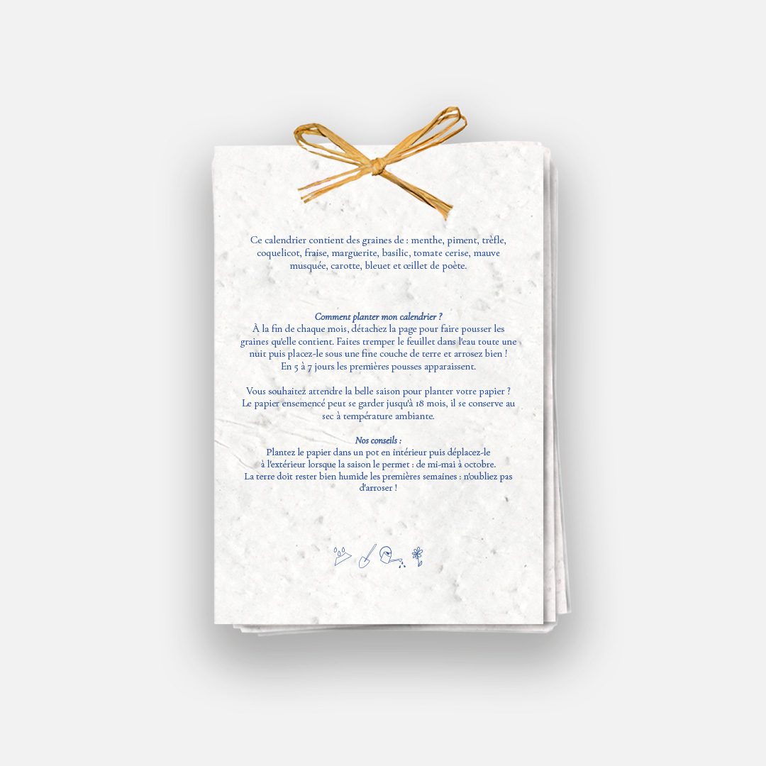 Ce calendrier écologique est imprimé sur du papier ensemencé. Ce papier, biodégradable et compostable, est fabriqué à partir de fibres recyclées. Il est serti de graines et peut être planté. À toutes les étapes de la fabrication et de l’impression, nous faisons en sorte que soient préservées les qualités germinatives et le caractère éco-responsable de nos produits.