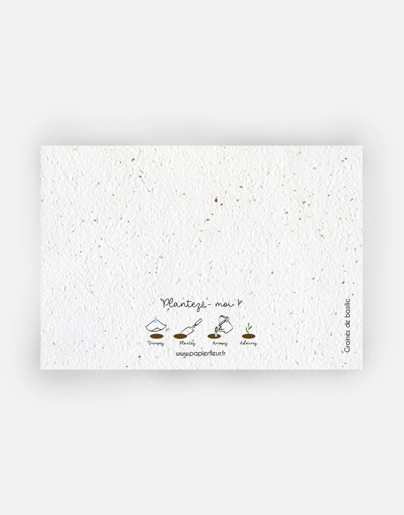 Cette carte est imprimée sur du papier ensemencé. Ce papier, biodégradable et compostable, est fabriqué à partir de fibres recyclées. Il est serti de graines et peut être planté. À toutes les étapes de la fabrication et de l’impression, nous faisons en sorte que soient préservés les qualités germinatoires et le caractère éco-responsable de nos produits.