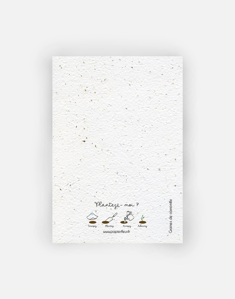 Cette carte est imprimée sur du papier ensemencé. Ce papier, biodégradable et compostable, est fabriqué à partir de fibres recyclées. Il est serti de graines et peut être planté. À toutes les étapes de la fabrication et de l’impression, nous faisons en sorte que soient préservés les qualités germinatoires et le caractère éco-responsable de nos produits.