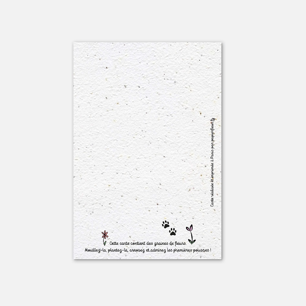 Cette carte est imprimée sur du papier ensemencé. Ce papier, biodégradable et compostable, est fabriqué à partir de fibres recyclées. Il est serti de graines et peut être planté. À toutes les étapes de la fabrication et de l’impression, nous faisons en sorte que soient préservés les qualités germinatoires et le caractère éco-responsable de nos produits.