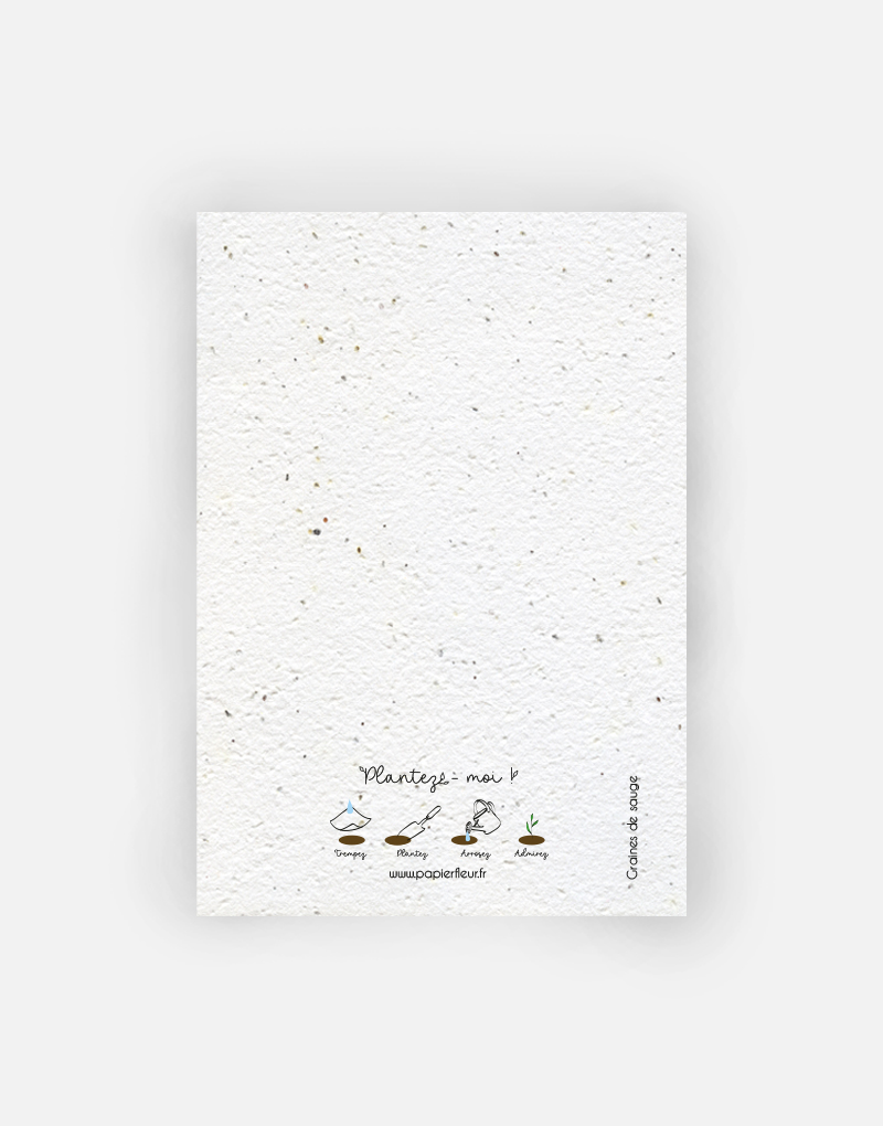 Cette carte est imprimée sur du papier ensemencé. Ce papier, biodégradable et compostable, est fabriqué à partir de fibres recyclées. Il est serti de graines et peut être planté. À toutes les étapes de la fabrication et de l’impression, nous faisons en sorte que soient préservés les qualités germinatoires et le caractère éco-responsable de nos produits.