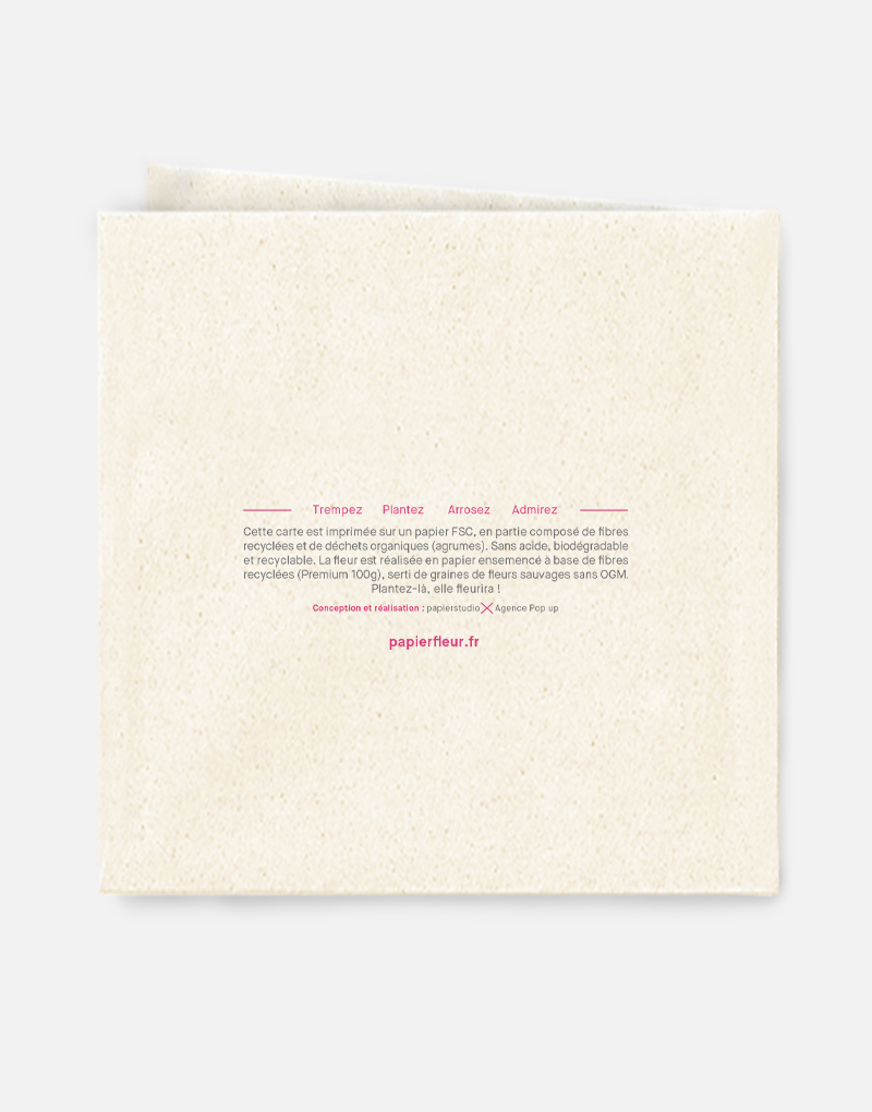 Cette carte est imprimée sur du papier ensemencé. Ce papier, biodégradable et compostable, est fabriqué à partir de fibres recyclées. Il est serti de graines et peut être planté. À toutes les étapes de la fabrication et de l’impression, nous faisons en sorte que soient préservés les qualités germinatoires et le caractère éco-responsable de nos produits.