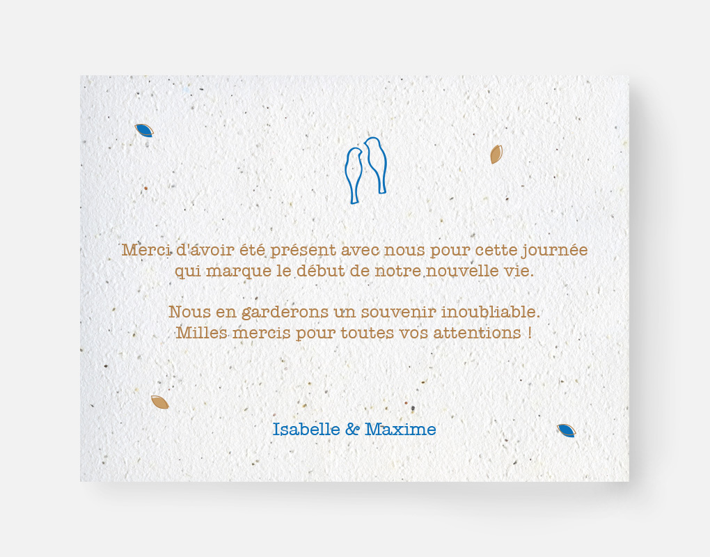 Ce faire-part est imprimé sur du papier ensemencé. Ce papier, biodégradable et compostable, est fabriqué à partir de fibres recyclées. Il est serti de graines et peut être planté. À toutes les étapes de la fabrication et de l’impression, nous faisons en sorte que soient préservés les qualités germinatoires et le caractère éco-responsable de nos produits.