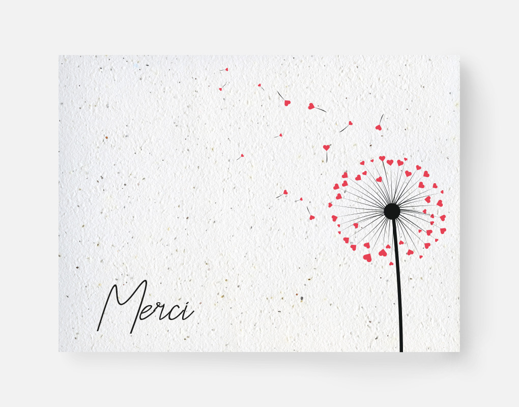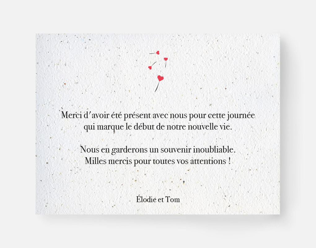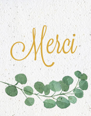 Ce faire-part est imprimé sur du papier ensemencé. Ce papier, biodégradable et compostable, est fabriqué à partir de fibres recyclées. Il est serti de graines et peut être planté. À toutes les étapes de la fabrication et de l’impression, nous faisons en sorte que soient préservés les qualités germinatoires et le caractère éco-responsable de nos produits.