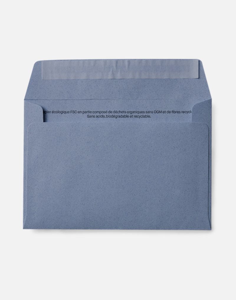Accompagner vos messages avec une enveloppe upcyclée conçue avec 100% d’énergie verte. Ce papier fabriqué à partir de résidus agro-industriels tels que les agrumes, cerise, olive, lavande ou raisin qui remplacent la pâte à papier vierge pour 15% et auxquels sont ajoutées 30% de fibres recyclées.