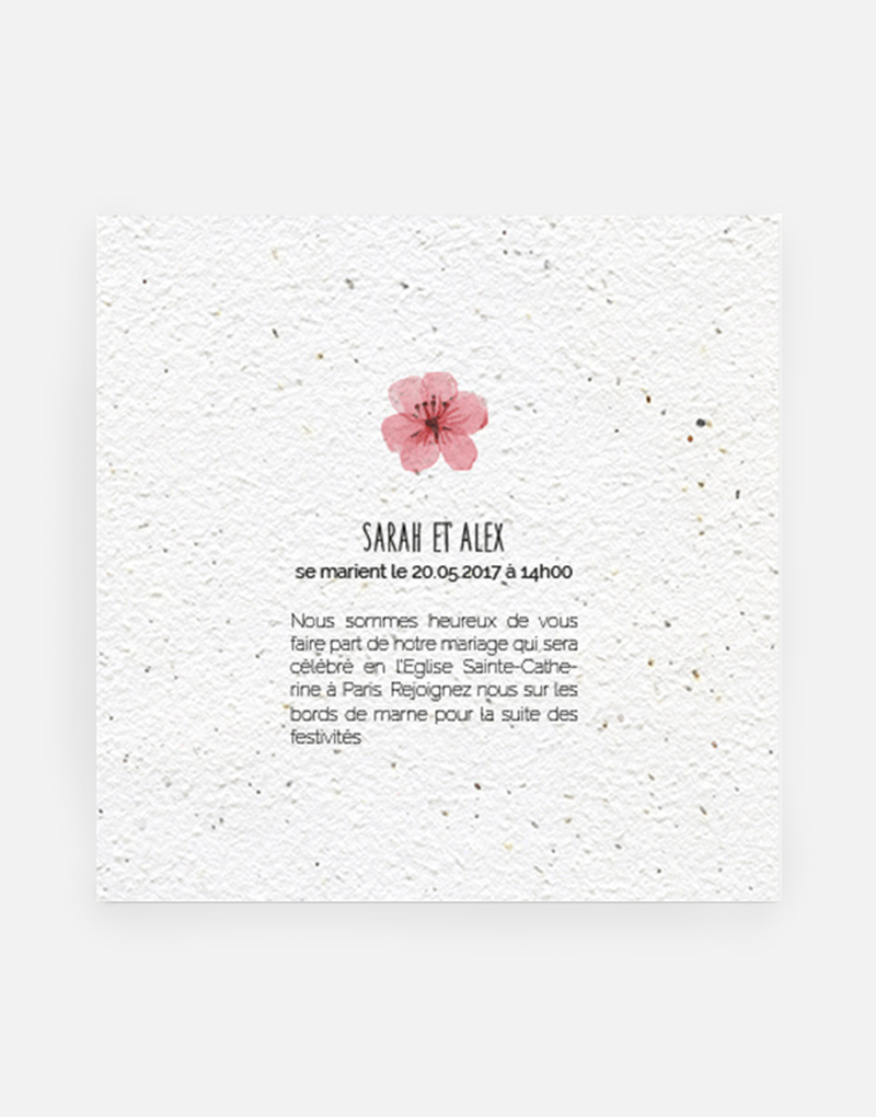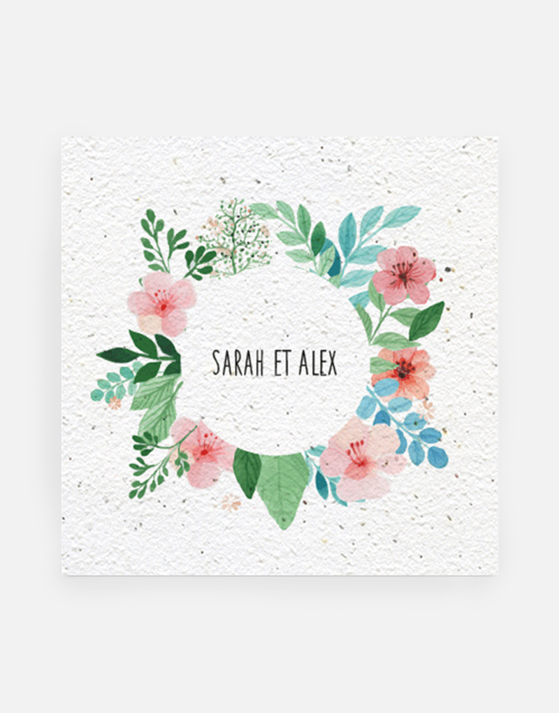 Ce faire-part est imprimé sur du papier ensemencé. Ce papier, biodégradable et compostable, est fabriqué à partir de fibres recyclées. Il est serti de graines et peut être planté. À toutes les étapes de la fabrication et de l’impression, nous faisons en sorte que soient préservés les qualités germinatoires et le caractère éco-responsable de nos produits.