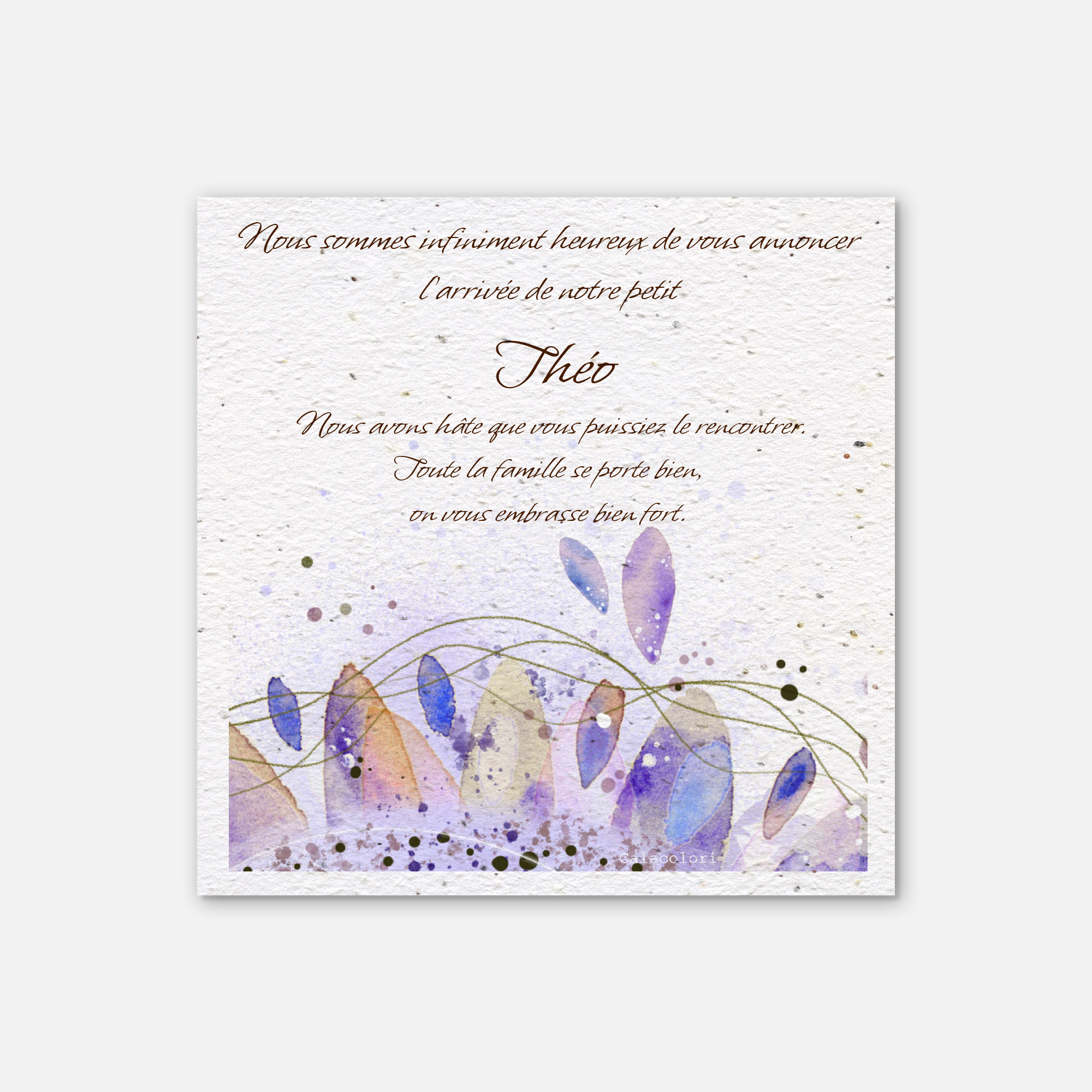 Cette carte est imprimée sur du papier ensemencé. Ce papier, biodégradable et compostable, est fabriqué à partir de fibres recyclées. Il est serti de graines et peut être planté. À toutes les étapes de la fabrication et de l’impression, nous faisons en sorte que soient préservés les qualités germinatoires et le caractère éco-responsable de nos produits.
