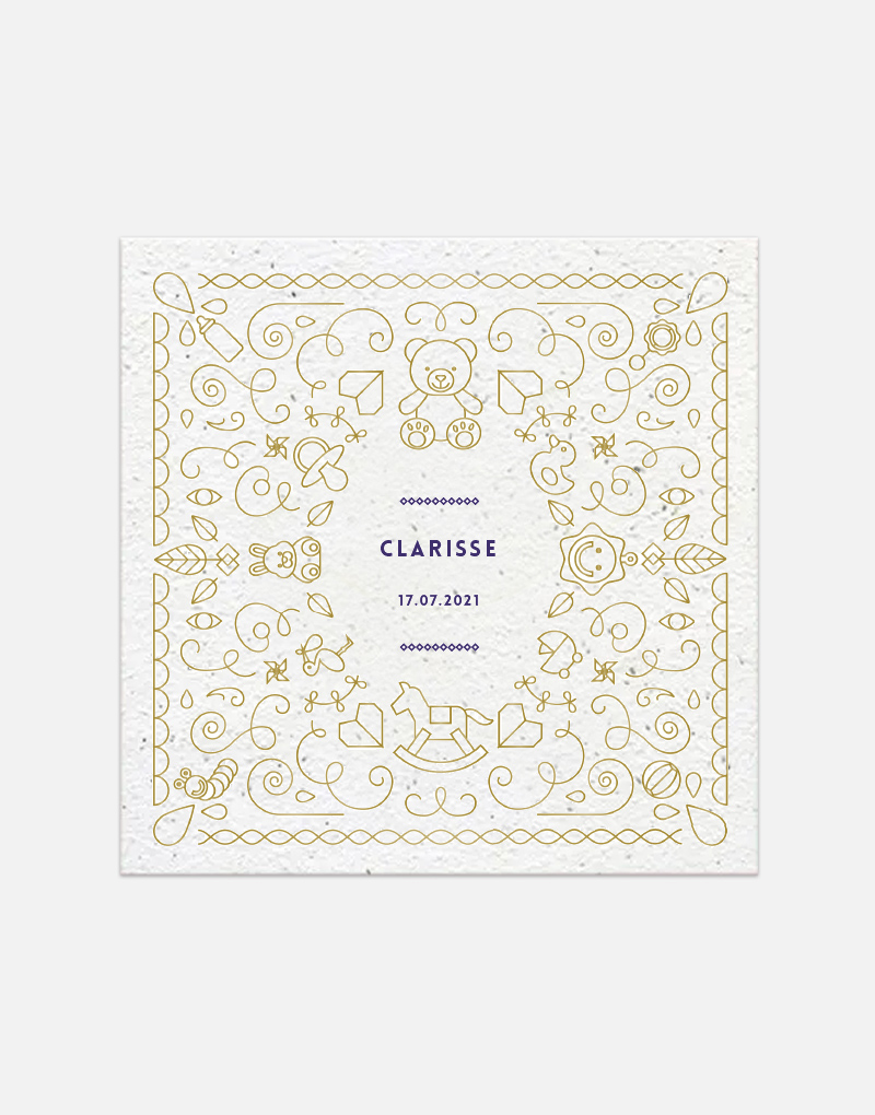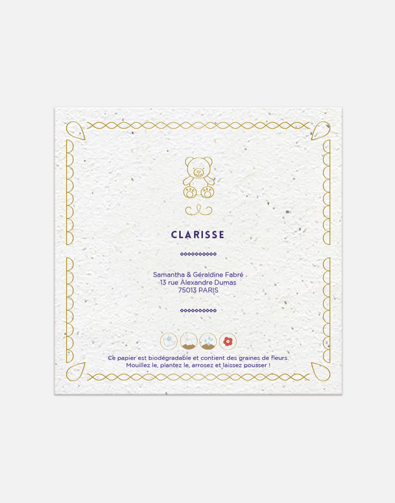 Ce faire-part est imprimé sur du papier ensemencé. Ce papier, biodégradable et compostable, est fabriqué à partir de fibres recyclées. Il est serti de graines et peut être planté. À toutes les étapes de la fabrication et de l’impression, nous faisons en sorte que soient préservés les qualités germinatoires et le caractère éco-responsable de nos produits.