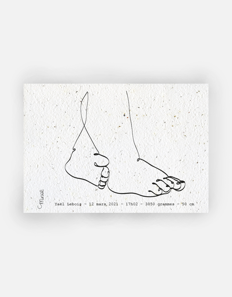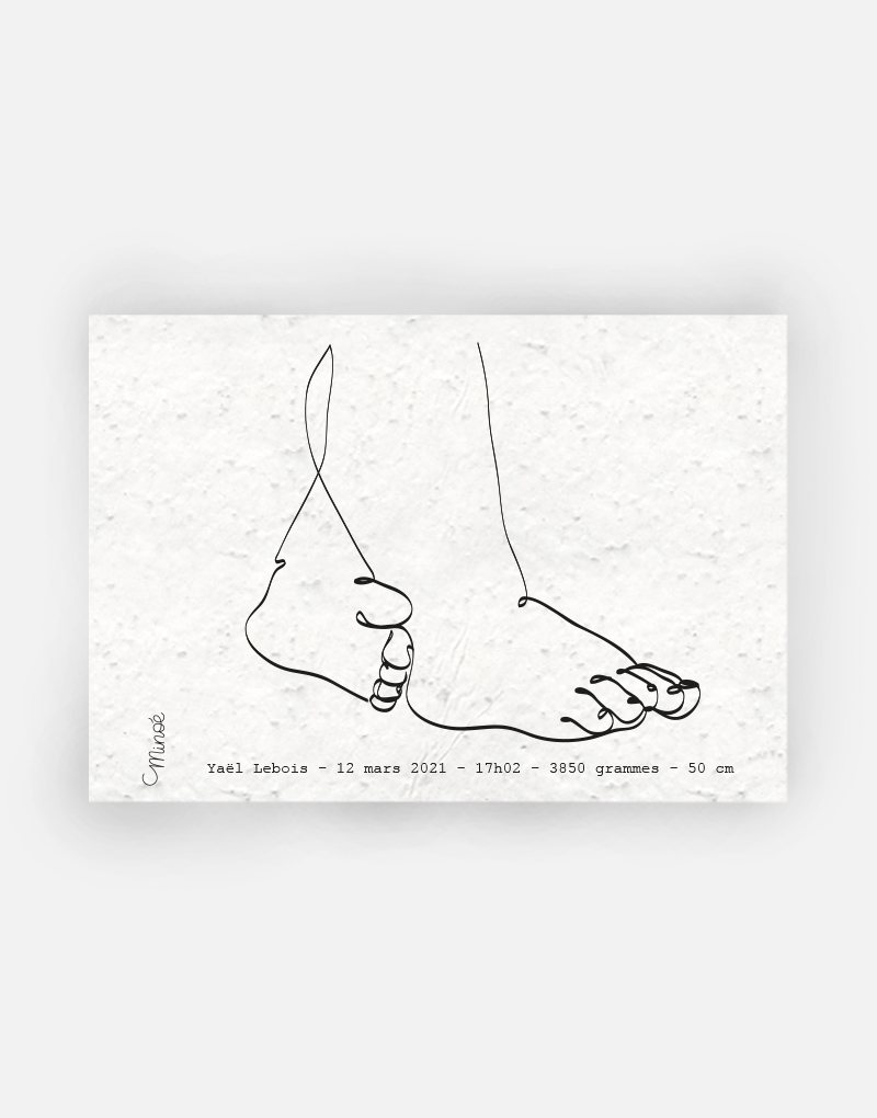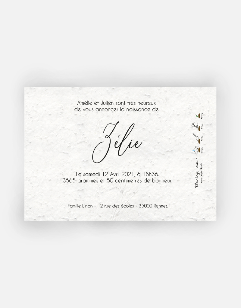 Ce faire-part est imprimé sur du papier ensemencé. Ce papier, biodégradable et compostable, est fabriqué à partir de fibres recyclées. Il est serti de graines et peut être planté. À toutes les étapes de la fabrication et de l’impression, nous faisons en sorte que soient préservés les qualités germinatoires et le caractère éco-responsable de nos produits.