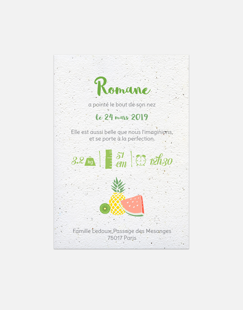 Ce faire-part est imprimé sur du papier ensemencé. Ce papier, biodégradable et compostable, est fabriqué à partir de fibres recyclées. Il est serti de graines et peut être planté. À toutes les étapes de la fabrication et de l’impression, nous faisons en sorte que soient préservés les qualités germinatoires et le caractère éco-responsable de nos produits.