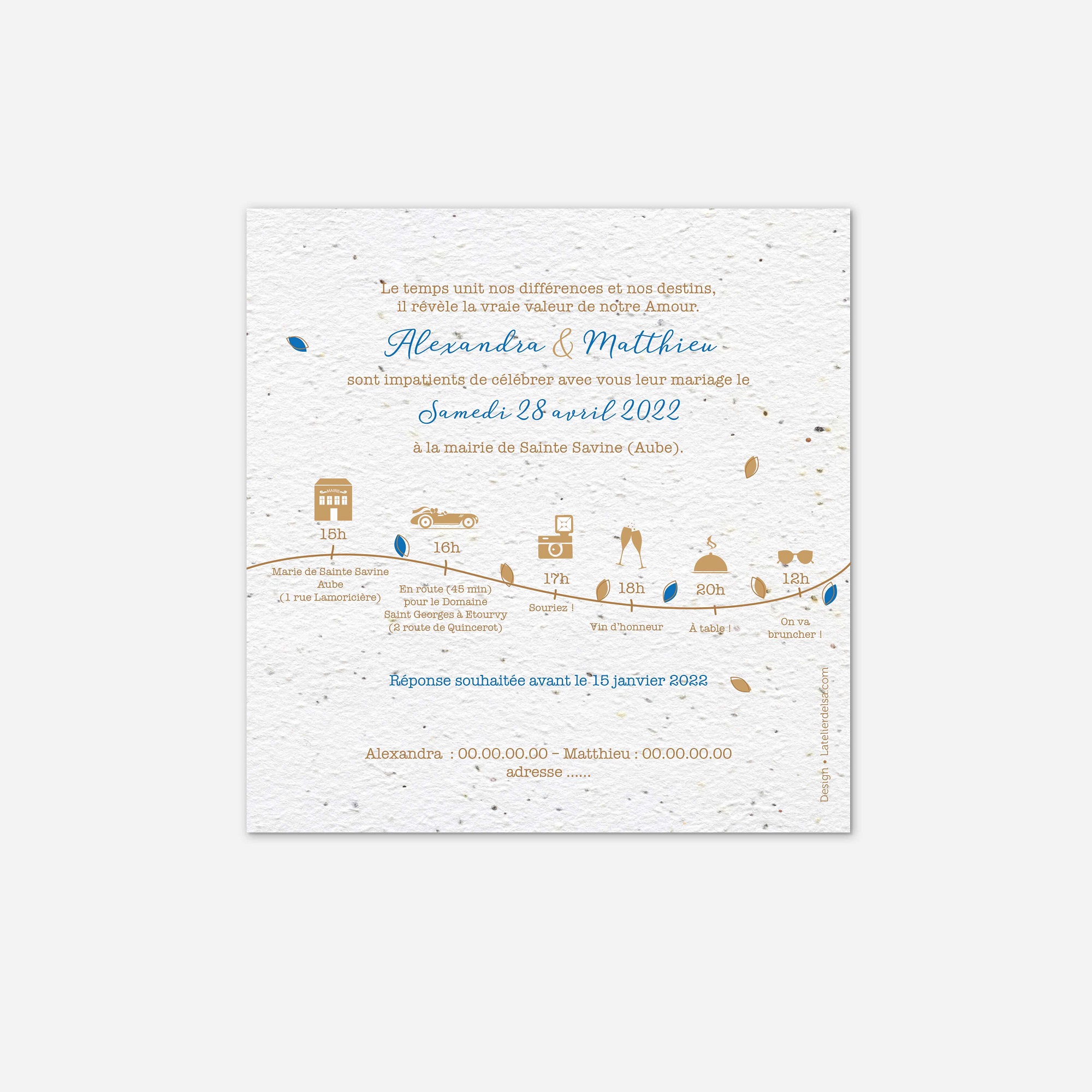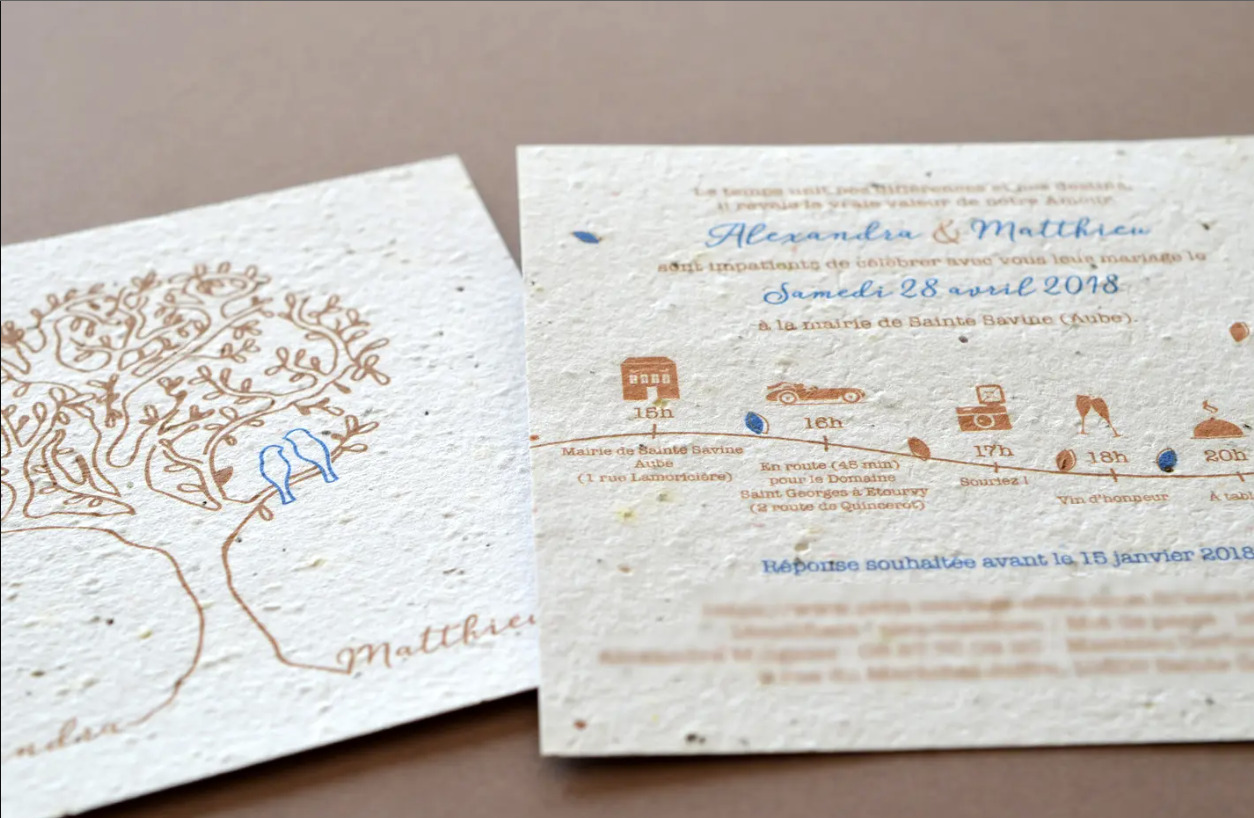 Ce faire-part est imprimé sur du papier ensemencé. Ce papier, biodégradable et compostable, est fabriqué à partir de fibres recyclées. Il est serti de graines et peut être planté. À toutes les étapes de la fabrication et de l’impression, nous faisons en sorte que soient préservés les qualités germinatoires et le caractère éco-responsable de nos produits.