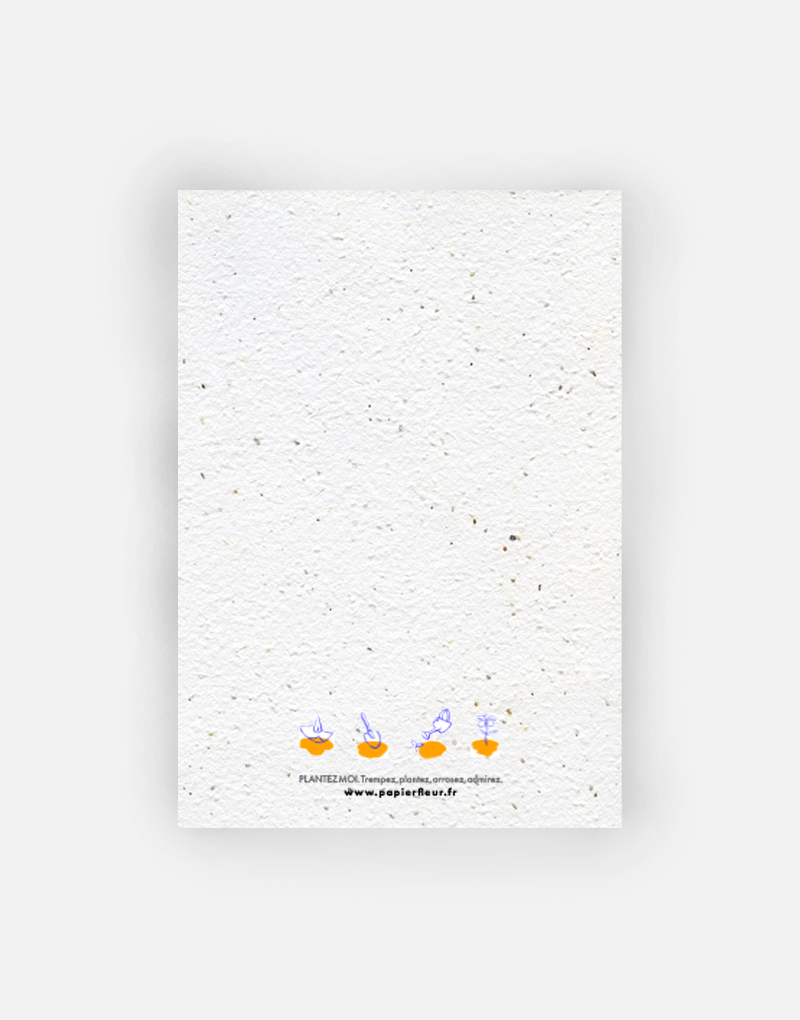 Cette carte est imprimée sur du papier ensemencé. Ce papier, biodégradable et compostable, est fabriqué à partir de fibres recyclées. Il est serti de graines et peut être planté. À toutes les étapes de la fabrication et de l’impression, nous faisons en sorte que soient préservés les qualités germinatoires et le caractère éco-responsable de nos produits.
