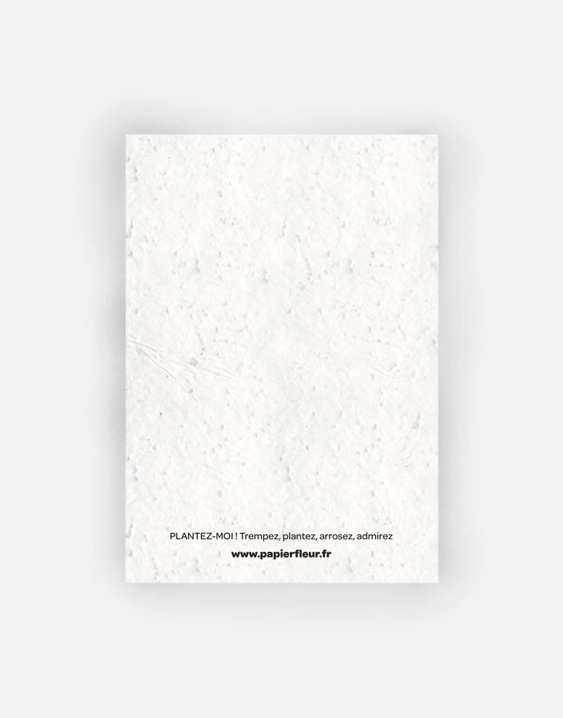 Cette carte est imprimée sur du papier ensemencé. Ce papier, biodégradable et compostable, est fabriqué à partir de fibres recyclées. Il est serti de graines et peut être planté. À toutes les étapes de la fabrication et de l’impression, nous faisons en sorte que soient préservés les qualités germinatoires et le caractère éco-responsable de nos produits.