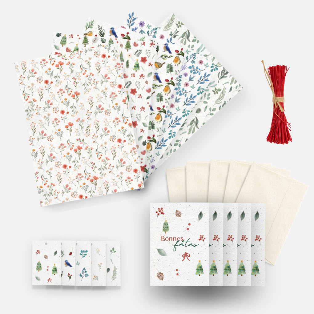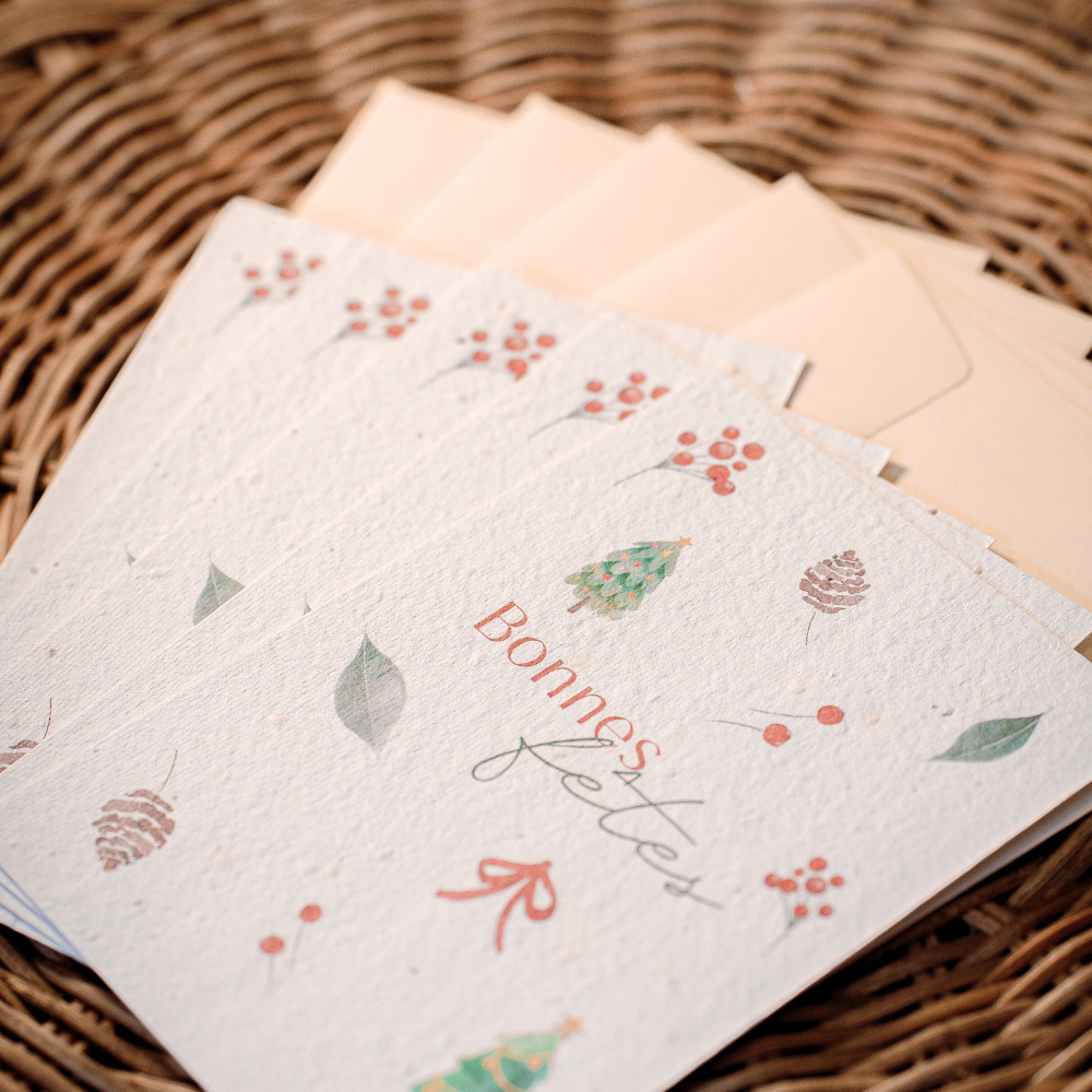 Des fêtes de fin d’année sous le signe du zéro déchet avec des décorations à planter. Fêtez Noël avec un kit qui se transforme en fleurs une fois les fêtes passées. Papier à planter pour des fêtes écolo, zéro déchet, 100% fleurs.