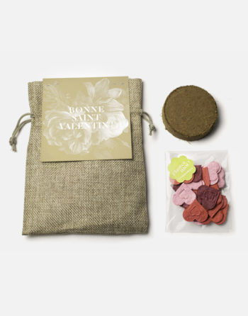 • Composition : sac en toile de jute, header à message en papier ensemencé et terre compressée en coco