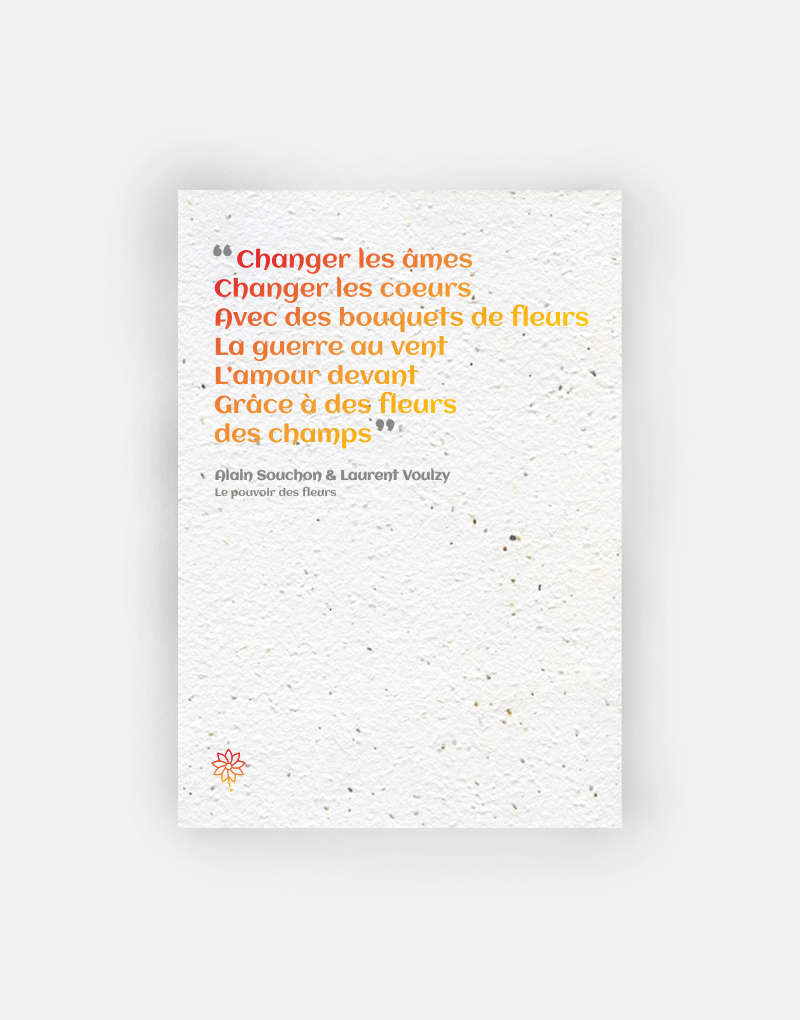 Cette carte est imprimée sur du papier ensemencé. Ce papier, biodégradable et compostable, est fabriqué à partir de fibres recyclées. Il est serti de graines et peut être planté. À toutes les étapes de la fabrication et de l’impression, nous faisons en sorte que soient préservés les qualités germinatoires et le caractère éco-responsable de nos produits.