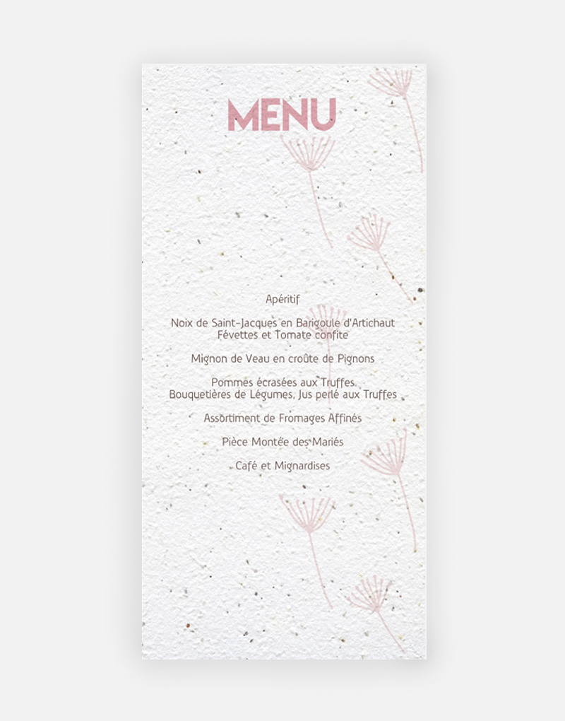 Ce menu est imprimé sur du papier ensemencé. Ce papier, biodégradable et compostable, est fabriqué à partir de fibres recyclées. Il est serti de graines et peut être planté. À toutes les étapes de la fabrication et de l’impression, nous faisons en sorte que soient préservés les qualités germinatoires et le caractère éco-responsable de nos produits.