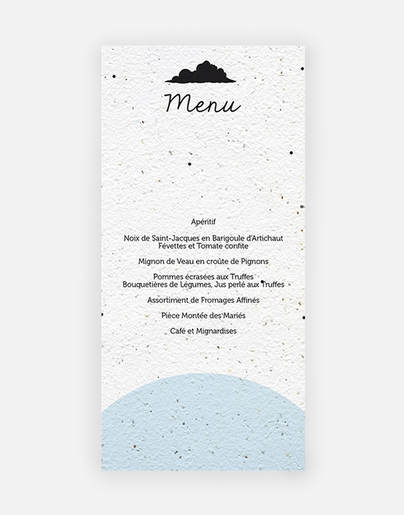 Ce menu est imprimé sur du papier ensemencé. Ce papier, biodégradable et compostable, est fabriqué à partir de fibres recyclées. Il est serti de graines et peut être planté. À toutes les étapes de la fabrication et de l’impression, nous faisons en sorte que soient préservés les qualités germinatoires et le caractère éco-responsable de nos produits.