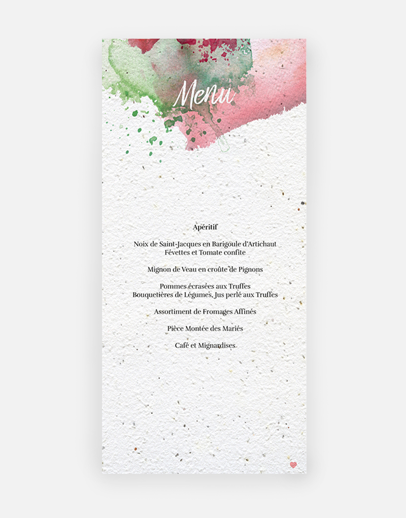 Ce menu est imprimé sur du papier ensemencé. Ce papier, biodégradable et compostable, est fabriqué à partir de fibres recyclées. Il est serti de graines et peut être planté. À toutes les étapes de la fabrication et de l’impression, nous faisons en sorte que soient préservés les qualités germinatoires et le caractère éco-responsable de nos produits.