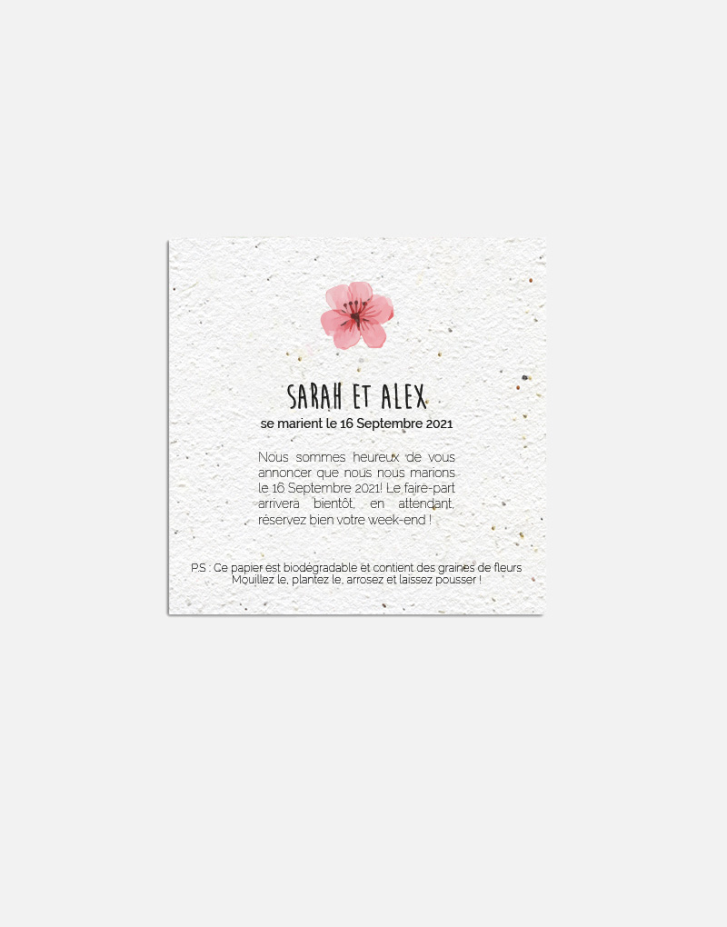 Ce save-the-date est imprimé sur du papier ensemencé. Ce papier, biodégradable et compostable, est fabriqué à partir de fibres recyclées. Il est serti de graines et peut être planté. À toutes les étapes de la fabrication et de l’impression, nous faisons en sorte que soient préservés les qualités germinatoires et le caractère éco-responsable de nos produits.