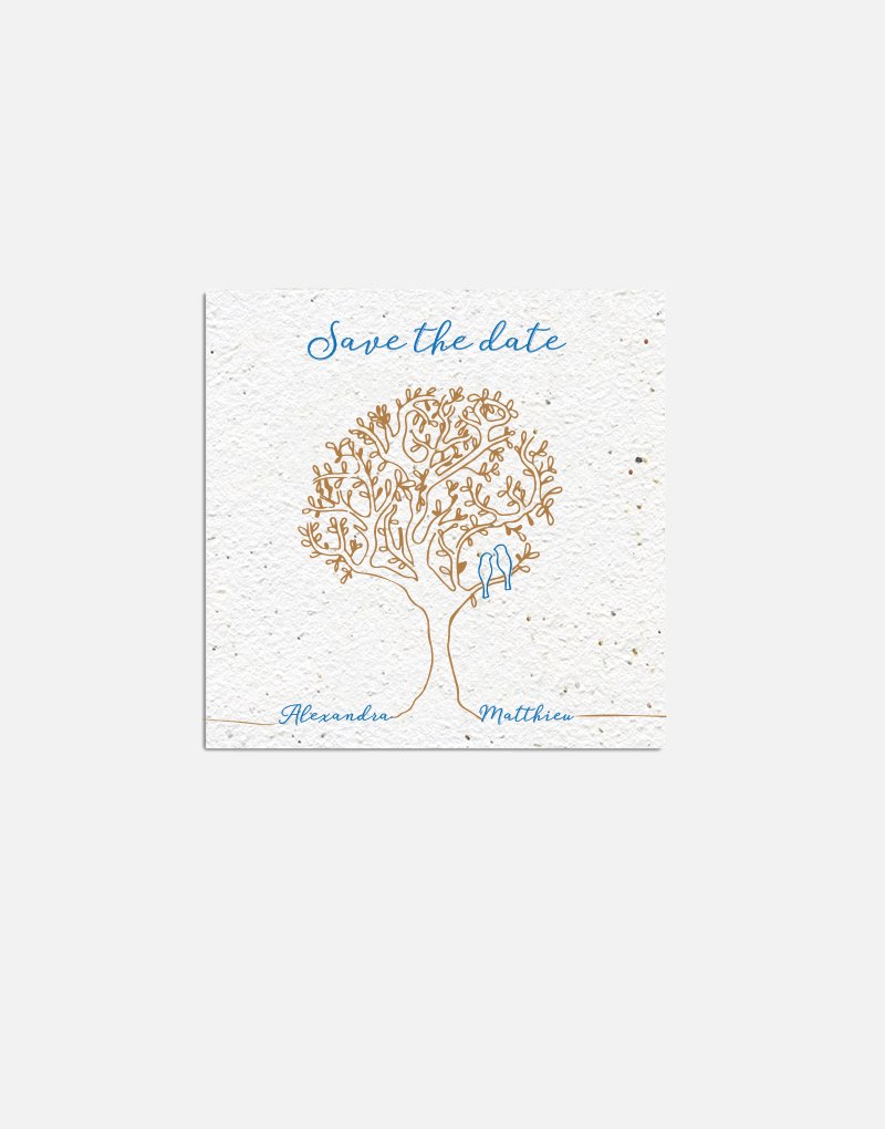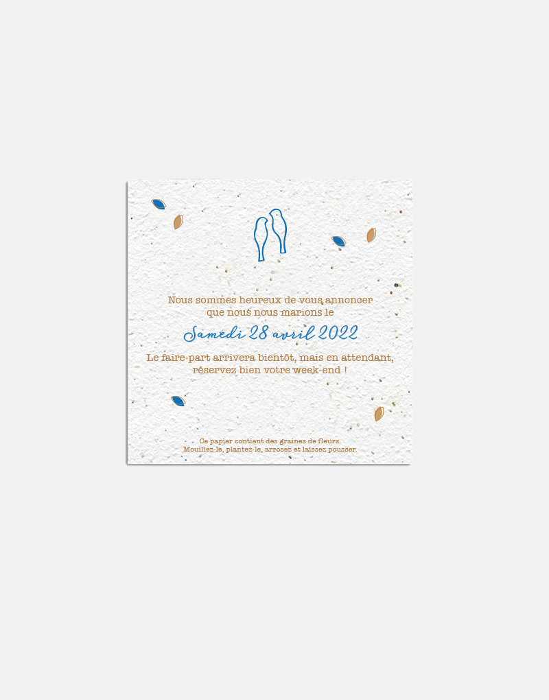 Ce save-the-date est imprimé sur du papier ensemencé. Ce papier, biodégradable et compostable, est fabriqué à partir de fibres recyclées. Il est serti de graines et peut être planté. À toutes les étapes de la fabrication et de l’impression, nous faisons en sorte que soient préservés les qualités germinatoires et le caractère éco-responsable de nos produits.
