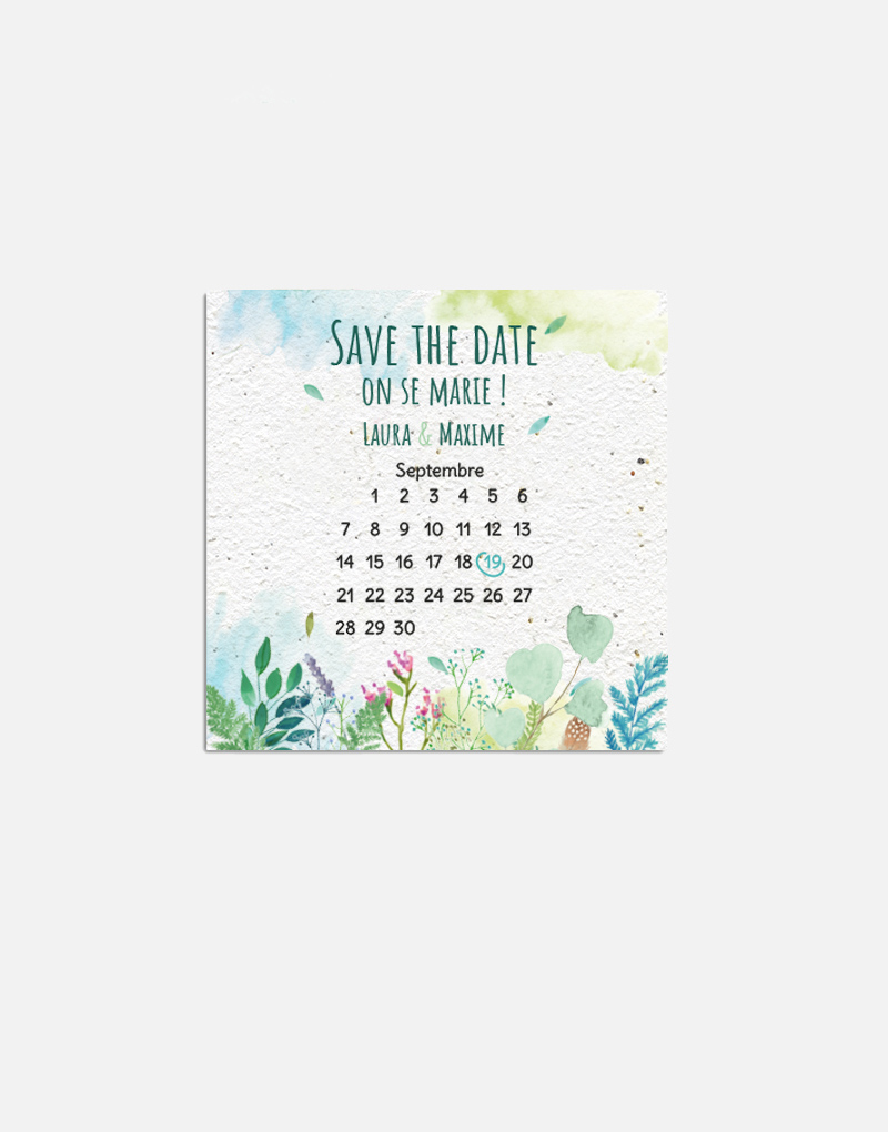 Ce save-the-date est imprimé sur du papier ensemencé. Ce papier, biodégradable et compostable, est fabriqué à partir de fibres recyclées. Il est serti de graines et peut être planté. À toutes les étapes de la fabrication et de l’impression, nous faisons en sorte que soient préservés les qualités germinatoires et le caractère éco-responsable de nos produits.