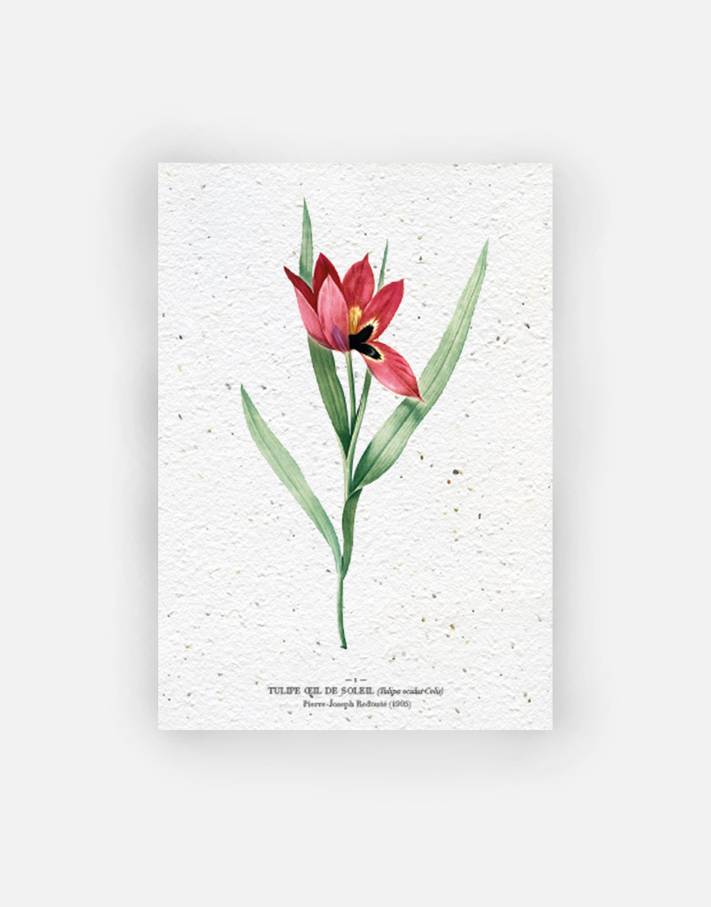 Cette carte est imprimée sur du papier ensemencé. Ce papier, biodégradable et compostable, est fabriqué à partir de fibres recyclées. Il est serti de graines et peut être planté. À toutes les étapes de la fabrication et de l’impression, nous faisons en sorte que soient préservés les qualités germinatoires et le caractère éco-responsable de nos produits.